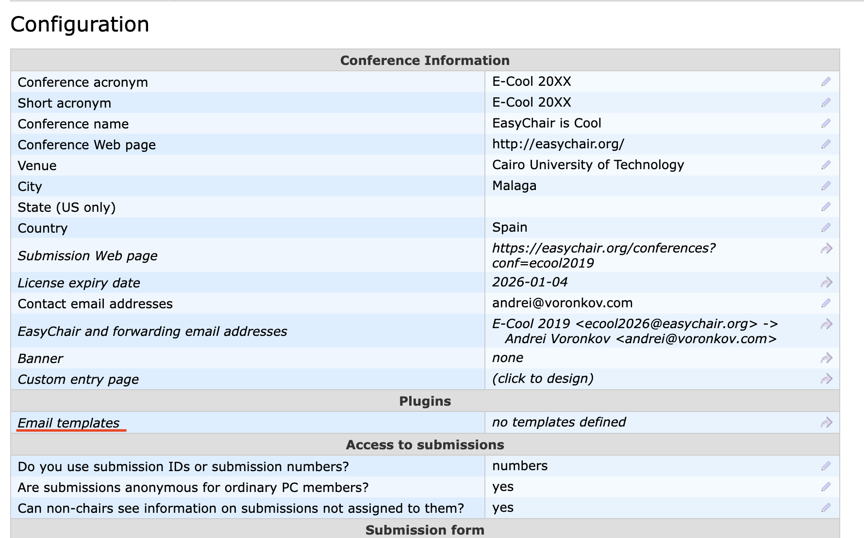 Email templates can also be shared across conferences using the configuration import/export feature, provided that consent is granted by one of your conference chairs.